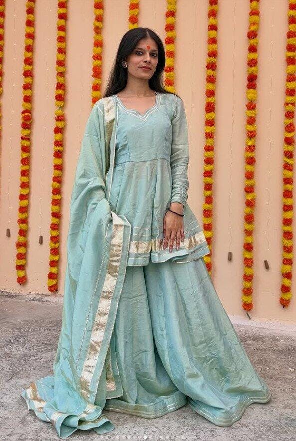 Mint Green Silk Blend Peplum Kurta with Sharara & Dupatta Set