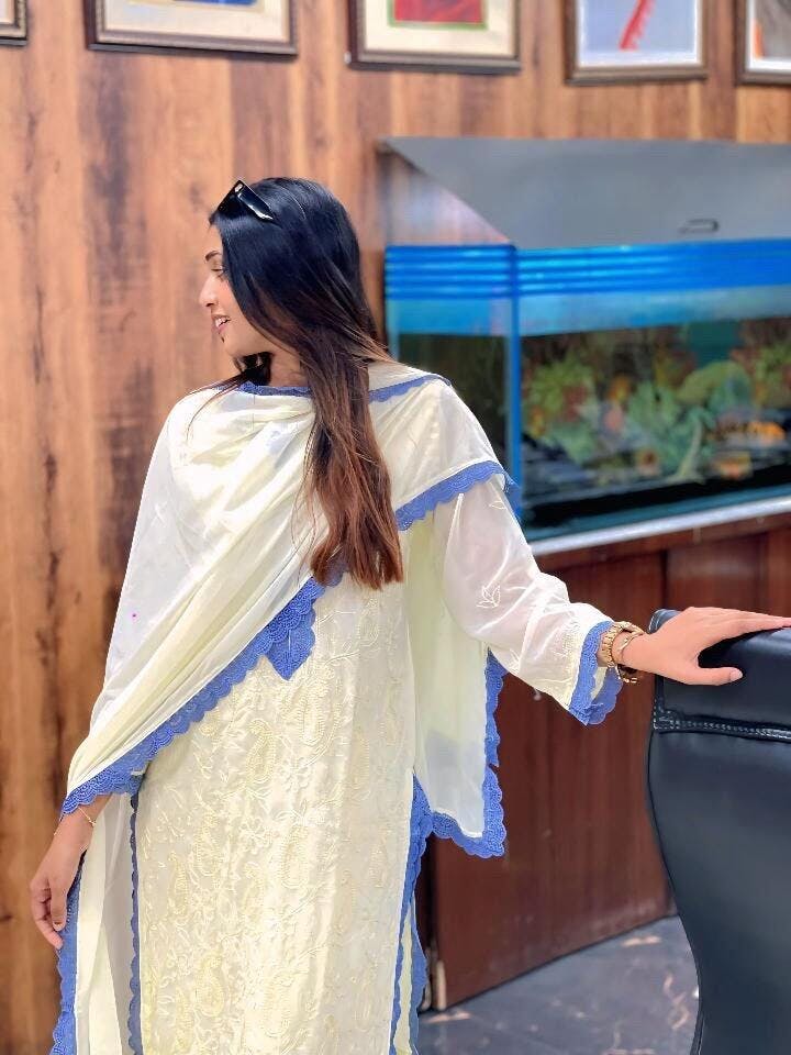 Cream Viscose Georgette Silk Chikankari Kurta With Palazzo And Dupatta Set